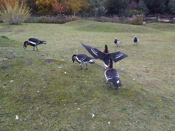Keywords: Mixt flock1.jpg en Mixt flock of Barnacle geese Branta leucopsis and Red-breasted Geese Branta ruficollis at WWT London Wetland Centre in London hu Vegyes lúd csapat apácalúdak Branta leucopsis és vörösnyakú lúdak Branta ruficollis a WWT London Wetland Centre-ben; London WWT London Wetland Centre Dénes Emőke 2010 október 28 Cc-zero Branta leucopsis captive Branta ruficollis in zoos Birds in WWT London Wetland Centre