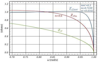 | Keywords: Mm'-Derived Low-pass Image Impedance.svg image impedances of prototype low-pass mm'-derived filter m-derived filter and constant-k filter in the region immediately below <var>ω</var> <var>ω</var><sub>c</sub> 1 The parameters of the mm'-derived filter are <var>m</var> 0 7230 <var>m'</var> 0 4124 <var>mm'</var> 0 3 The parameter of the m-derived filter is <var>m</var> 0 6 These filters both have the optimum impedance matching for their types <math>Z_ iT mm' \frac \sqrt 1-\omega 2 \left 1- 1-m 2 \omega 2 \right 1-\left \omega/\omega_\infin\right 2 </math> where <math>\omega_\infin \frac \omega_c \sqrt 1- mm' 2 </math> <math>Z_ iT m \frac \sqrt 1-\omega 2 1-\left \omega/\omega_\infin\right 2 </math> where <math>\omega_\infin \frac \omega_c \sqrt 1-m 2 </math> <math>Z_ iT \sqrt 1-\omega 2 </math> own 2009-11-26 Inductiveload Mathematica Code <pre><nowiki> wc 1; mm'-derived m1 0 7230; m2 0 4134; mm m1 m2; winfmm wc/Sqrt1 - mm 2; zitmmw_ Sqrt1 - w 2 1 - 1 - m1 2 w 2 / 1 - w/winfmm 2 ; m-derived m 0 6; winfm wc/Sqrt1 - m 2; zitmw_ Sqrt1 - w 2/ 1 - w/winfm 2 ; constant-k zitw_ Sqrt1 - w 2 Plot zitmmw zitmw zitw w 0 6 1 PlotRange -> All </nowiki></pre> M-Derived filters Mm'-Derived filters Constant-k filters Image impedance |