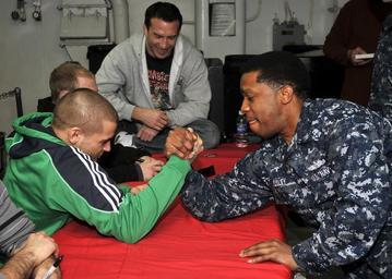 Keywords: MMA Fighters Tour USS George Washington DVIDS357785.jpg en Petty Officer 3rd Class Christopher Mosley electronics technician from Los Angeles arm wrestles with mixed martial artist Dustin Poirier during a mixed martial arts fighter's tour aboard the aircraft carrier USS George Washington The fighters are on a Pacific tour sponsored by Armed Forces Entertainment which will include visits to several Navy bases in Guam Hawaii and Japan 2011-01-13 Photo by Petty Officer 3rd Class David A Cox https //www dvidshub net/image/357785 110113-N-+++++-016 2011-01-15 06 34 YOKOSUKA JP PD-USGov-Military-Navy USS George Washington CVN-73 Images from DoD uploaded by Fæ Dustin Poirier |