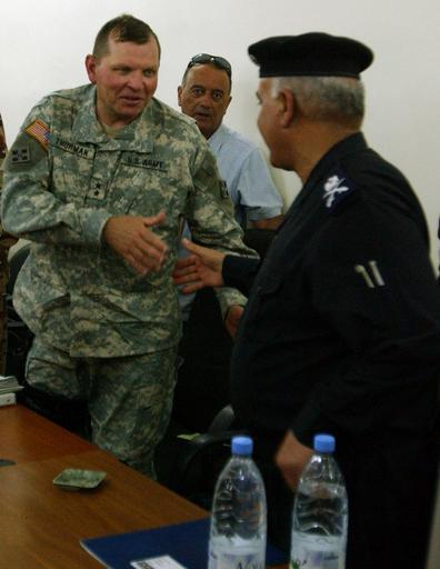 | Keywords: MND-B Commander Meets With South Baghdad Sheiks DVIDS24251.jpg en FOB KALSU Iraq--Maj Gen James D Thurman commander Multi-National Division-Baghdad greets Maj Gen Qais Hamza Babil provincial police chief June 22 at the Iraqi Highway Patrol headquarters in Tounis The leaders met with sheiks from the southern Baghdad and northern Babil provinces to discuss ways to curb violence n the region and move Iraq forward in its quest to be great again U S Army photo by Cpl Michael Molinaro 2nd BCT PAO 4ID 2006-06-26 Michael Molinaro https //www dvidshub net/image/24251 24251 2006-06-26 13 36 KALSU IQ PD-USGov James D Thurman Images from DoD uploaded by Fæ |