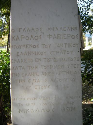 | Keywords: Mnimeio favierou palataki haidari.JPG  el Το  νημείο Κάρολου Φαβιέρου είναι ίσως το  αλιότερο μνημείο του Χαϊδαρίου αφού φιλοτεχνήθηκε με  ρωτοβουλία του  ικολάου Θων  ρος τιμήν του φιλέλληνα Κάρολου Φαβιέρου για την συμβολή του στις μάχες του Χαϊδαρίου στις 6 και 8 Αυγούστου 1821 Σήμερα η  ροτομή είναι α οκομμένη α ό την μαρμάρινη στήλη η ο οία συνεχίζει να κοσμεί τον  ερίβολο της έ αυλης Παλατάκι μ ροστά α ό το αναψυκτήριο «Ιστορικόν» Το στηθαίο του μνημείου βρίσκεται σήμερα στην αίθουσα Δημοτικού Συμβουλίου στο νέο Δημαρχείο αφού υ έστη εργασίες συντήρησης ΦΩΤΟΓΡΑΦΙΑ ΔΗ ΟΣ ΧΑΪΔΑΡΙΟΥ ΑΓ ΩΣΤΗ Cc-zero Uncategorized 2014 April 23 Κατηγορία Χαϊδάρι |