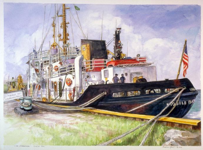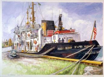 Keywords: Mobile Bay by Sandra Hart DVIDS1082900.jpg en S Coast Guard Cutter Mobile Bay is the third of nine cutters in the Coast Guard's Bay class of icebreaking tugs She is equipped with the second of two 120-foot aids to navigation buoys barges operating on the Great Lakes Homeported in Sturgeon Bay Wisconsin the Coast Guard Cutter Mobile Bay has dual responsibilities in assisting navigation in the Great Lakes During the winter months the cutter detaches from the barge and breaks ice in the northern Great Lakes operating mostly in the straits of Mackinac and the St Marys River the waterway which joins Lakes Superior and Huron 2007-06-12 https //www dvidshub net/image/1082900 1082900 2013-12-11 19 50 PD-USGov Sturgeon Bay Wisconsin Mobile Bay tugboat 1979 Images from DoD uploaded by Fæ |
