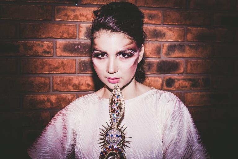 Keywords: model girl dress view beauty dark background fashion style jacket female emotions long hair photoshoot table hairstyle hair posture sitting cosmetics hands