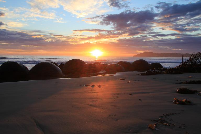 | Keywords: outdoor seaside shore landscape beach sunset sky dusk The Moeraki Boulders are unusually large and spherical boulders lying along a stretch of Koekohe Beach on the wave-cut Otago coast of New Zealand between Moeraki and Hampden. They occur scattered either as isolated or clusters of boulders within a stretch of beach where they have been protected in a scientific reserve. The erosion by wave action of mudstone, comprising local bedrock and landslides, frequently exposes embedded isolated boulders. These boulders are grey-colored septarian concretions, which have been exhumed from the mudstone enclosing them and concentrated on the beach by coastal erosion. en.wikipedia.org/wiki/Moeraki_Boulders en.wikipedia.org/wiki/Sunrise The Moeraki Boulders are unusually large and spherical boulders lying along a stretch of Koekohe Beach on the wave-cut Otago coast of New Zealand between Moeraki and Hampden. They occur scattered either as isolated or clusters of boulders within a stretch of beach where they have been protected in a scientific reserve. The erosion by wave action of mudstone, comprising local bedrock and landslides, frequently exposes embedded isolated boulders. These boulders are grey-colored septarian concretions, which have been exhumed from the mudstone enclosing them and concentrated on the beach by coastal erosion. en.wikipedia.org/wiki/Moeraki_Boulders en.wikipedia.org/wiki/Sunrise |