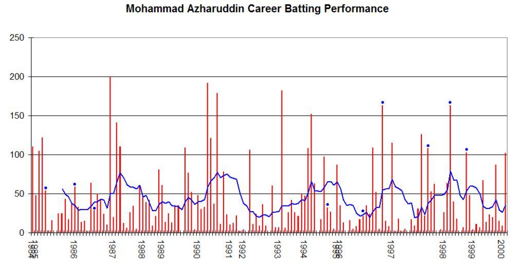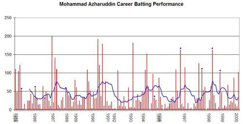 | Keywords: Mohammad Azharuddin Graph.png Test Match performance of Mohammad Azharuddin It was created by Raven4x4x The red bars indicate the player's test match innings while the blue line shows the average of the ten most recent innings at that point Note that this average cannot be calculated for the first nine innings The blue dots indicate innings in which Azharuddin finished not-out This graph was generated with Microsoft Excel 2002 using data from http //www cricinfo com/ Cricinfo and http //www howstat com au Howstat com au 2005-11-07 Own Raven4x4x wikipedia en Raven4x4x Original upload log page en wikipedia Mohammad_Azharuddin_Graph png 2005-11-07 10 55 Raven4x4x 963×492 7314 bytes <nowiki>This graph details the Test Match performance of Mohammad Azharuddin The red bars indicate the player's test match innings while the blue line shows the average of the ten most recent innings at that point Note </nowiki> DEFAULTSORT Azharuddin Mohammad Test cricketers graphs of India |