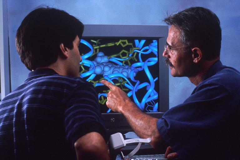 | Keywords: Molecular modeling.jpg Two adult caucasian men sit in front of a computer that displays molecular modeling Topics/Categories People -- Adult Science and Technology -- Laboratory Techniques/Equipment Type Color Photo Source National Cancer Institute Dr Jason Kang Photographer 1845 2000-10 Reuse Restrictions None - This image is in the public domain and can be freely reused Please credit the source and/or author listed above Dr Jason Kang Photographer PD-USGov-HHS-NIH Media from National Cancer Institute Visuals Online Images uploaded by Fæ Molecular modelling People using computers in the 2000s Pointing at screens |