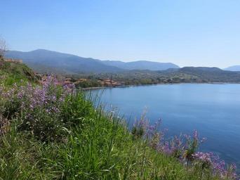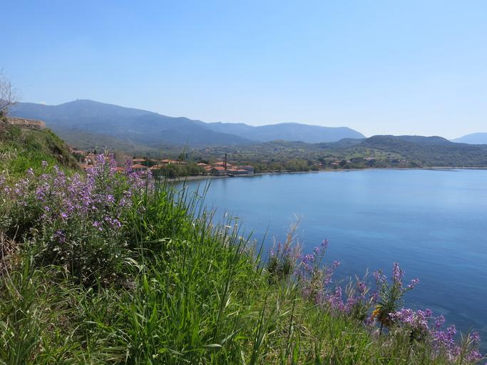 Keywords: molivos coast sea wild flowers bay mountains scenic coastline island idyllic landscape molyvos mythimna lesvos greece