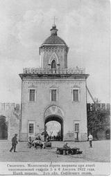 Keywords: Molohovskie gate 4.jpg en View on Molohovskie gate now do not exist from the current Victory Square ru Вид на олоховские во ота ныне не существуют со сто оны нынешней площади Победы О игинальная отк ытка е установлены before 1917 года PD-RusEmpire 20th-century postcards Postcards of Smolensk Molohovskie gate |