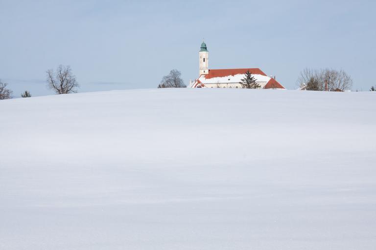 Keywords: monastery church baroque trees sky blue snow white sunny wintry hill upper bavaria