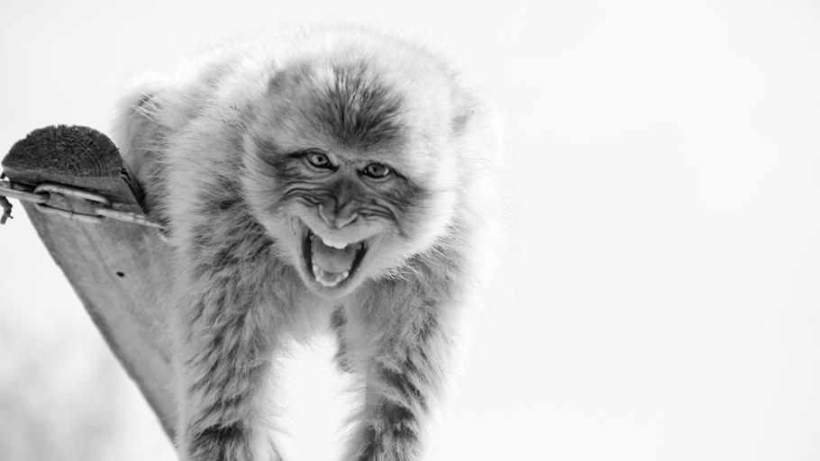 Keywords: monkey cry roar wildlife reserve nature nature park mature national park watch incisors dangerous animal world wilderness tooth mouth head animal portrait open yawn barbary ape black white
