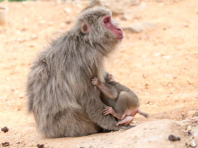 Keywords: monkey mother baby hugging animal wildlife mammal young small cute arashiyama monkey park japan
