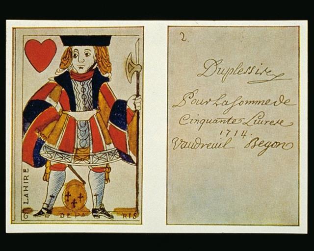 Keywords: Monnaie de carte, Canada, 1714.jpg fr 1714 Carte à jouer ayant une valeur de monnaie dans la colonie du Canada utilisée lorsque la monnaie métallique vient à manquer Crédit COLLECTION NATIONALE DE MONNAIES MUSÉE DE LA BANQUE DU CANADA 1714-01-01 http //www montrealenhistoires com/img/ARCHIVES-HR/CMM-0199-HR jpeg Copie attribuée à Henri Beau other versions PD-old-70-1923 Card money New France Canada in the 1710s |