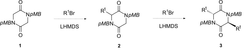 Keywords: Mono-and di-Alkylation of 2,5-Diketopiperazines.svg en Enolate akylation at C-3 and C-6 2016-05-18 own Alandb other versions cc-zero Diketopiperazines