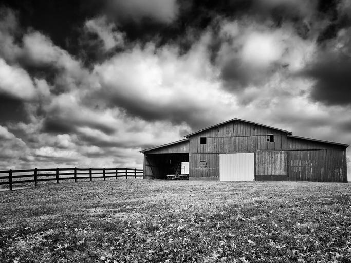 Keywords: monochrome black and white country rural landscape barn field countryside grass fence farm farmland outdoor scene land agricultural lawn sky