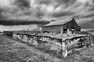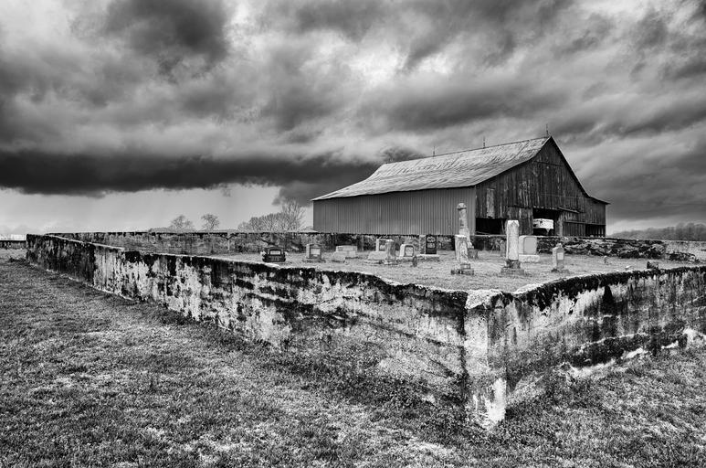 Keywords: monochrome black and white country rural barn field clouds farm landscape countryside outdoor grass meadow farmland scenic cemetery graveyard