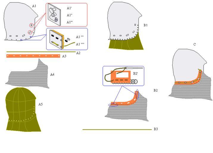 | Keywords: Montage d'un camail sur bacinet.PNG Description A Démonté A1 - Calotte Détail de différents types de vervelles possible - Type ancien rivet terminé par un bouton - Type courant Rivet percé - Variante anneaux ou tunnels de tôle rivé sur la calotte Montage possible de la doublure - Rivet le plus courant - Laçage Archaique A2 - lien servant à solidariser le camail à la calotte A3 - Support du camail C'est une bande de cuir ou de tissu percer pour le passage des vervelles A4 - Camail A5 - Doublure Dérivé des bonnets rembourés porté sous le casque les doublures de bacinet pouvait en avoir conservé la forme comme dans l'exemple ou avoir une ouverture réglable au sommet pour mieux l'adapter à l'utilisateur En général les doublures étaient fermer au niveau du menton cagoule plutôt que bonnet et continuait plus bas que la tête pour doubler aussi le camail B Demi monté B1 - calotte avec la doublure rivé B2 - Camail monté sur son support Détail de la couture du camail sur le support B3 - lien servant à solidariser le camail à la calotte C Bacinet monté Le support de camail a été positionné sur les vervelles Le lien a été passé dans les vervelles puis noué à chaque bout Dans le cas des vervelles se terminant par un bouton il n'y avait pas de lien mais les ouvertures du support étaient des boutonnières Source Dessiné par Tadiff JF ---- Licence ---- technology Bascinets |
