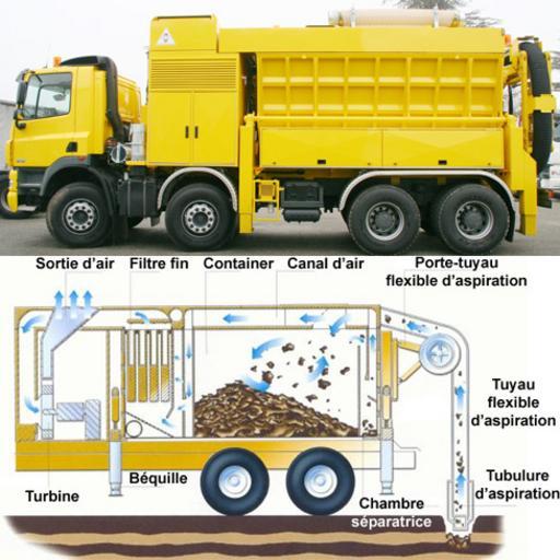 Keywords: Montage fonctionnement aspiratrice.jpg 2009-01-23 own assumed Mickaël Lucas Français Schéma de fonctionnement de l'excavatrice-aspiratrice English Operating scheme of suction excavator Sortie d'air air vent Filtre fin air filter Container container Canal d'air air channel Tuyau flexible d'aspiration flexible suction hose Porte-tuyau flexible d'aspiration holder for flexible suction hose Turbine air-propelling fan Béquille normally crutch; here support Chambre séparatrice separation chamber Suction excavators Air filters |
