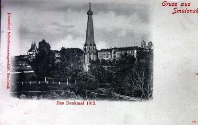 Keywords: Monument to the Heroes of the Patriotic War of 1812.jpg en Monument to the Heroes of the Patriotic War of 1812 In the background - Men's Gymnasium now - high school named Przewalski ru Памятник ге оям Отечественной войны 1812 года а заднем плане - мужская гимназия ныне - гимназия имени П жевальского О игинальная отк ытка Изд Д езденского писчебумажного магазина в Смоленске before 1917 года PD-RusEmpire 20th-century postcards Postcards of Smolensk