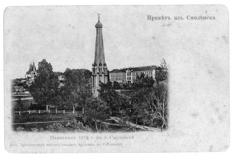 | Keywords: Monument to the Heroes of the Patriotic War of 1812 4.jpg en Monument to the Heroes of the Patriotic War of 1812 In the background - Men's Gymnasium now - high school named Przewalski ru Памятник ге оям Отечественной войны 1812 года а заднем плане - мужская гимназия ныне - гимназия имени П жевальского О игинальная отк ытка Изд Д езденского писчебумажного магазина в Смоленске before 1917 года PD-RusEmpire 20th-century postcards Postcards of Smolensk | ||||