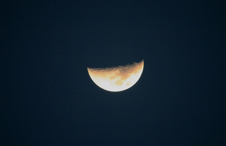 Keywords: moon half orbital white yellow shining crater marks sky evening