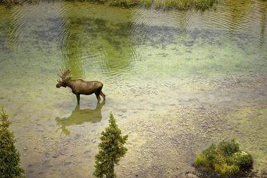 Keywords: moose river nature water wildlife animal antlers greenery reflection scenic