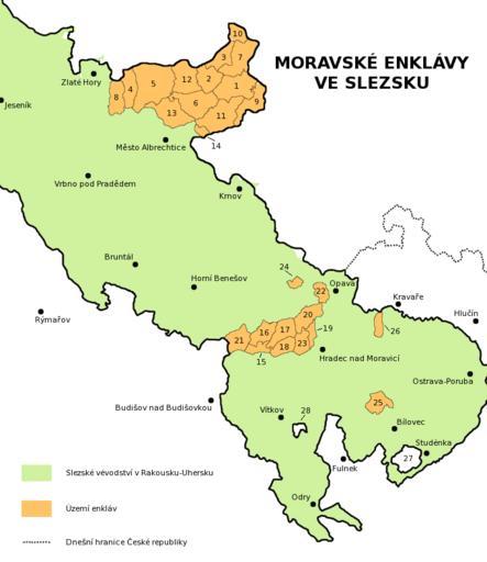 | Keywords: Moravske.enklavy.ve.Slezsku.png Území enkláv se skládalo z následujících celků čísla odpovídají číslům na mapě Osoblažská enkláva německy Hotzenplotzer Ländchen celá území bývalých soudních okresů Jindřichov a Osoblaha bylo největším územím v Enklávách o rozloze 219 32 km² a je dnes výběžkem Česka do Polska Patřily k němu tyto obce 1 Bohušov též Dolní Povelice Karlov Kašnice Ostrá Hora dnes části Bohušova 2 Dívčí Hrad též Sádek Životice dnes části Dívčího hradu 3 Hlinka 4 Janov 5 Jindřichov 6 Liptaň též Bučávka Horní Povelice dnes části Liptaně 7 Osoblaha též Studnice dnes část Osoblahy 8 Petrovice 9 Rusín včetně Hrozové a Matějovic ale bez parcely 246/2 která byla původně součástí polského Slezska 10 Slezské Pavlovice původně Německé Pavlovice s výjimkou malého dříve slezského území mezi Prudnikem a Sádeckým potokem 11 Slezské Rudoltice původně Rudoltice též Koberno Nový les Víno dnes části Slezských Rudoltic a 12 Vysoká též Bartultovice Pitárné dnes části Vysoké ; dále pak katastrální území 13 Piskořov dnes část Města Albrechtice a 14 Třemešná dnes část obce Třemešná Historickou součástí Osoblažska jsou i některé pozemky které byly roku 1959 předány Polsku výměnou za jiné Moravský výběžek v okolí Litultovic a Životic zasahující až na současné území statutárního města Opavy Tato část měla rozlohu 72 01 km² Jedná se o obce 15 Lhotka u Litultovic 16 Litultovice s výjimkou Choltic které nebyly součástí původního katastru Litultovic 17 Dolní Životice též Hertice dnes část Dolních Životic 18 Mikolajice 19 Uhlířov 20 Slavkov a o katastrální území 21 Deštné dnes část obce Jakartovice 22 Jaktař dnes část statutárního města Opavy a 23 Štáblovice dnes součást obce Štáblovice Katastrální území 24 Vlaštovičky dnes součást opavské městské části Vlaštovičky Tato enkláva měla rozlohu 2 5056 km² Území obce 25 Slatina včetně jejích někdejších místních částí Ohrada dnes část obce Bílovec a Karlovice dnes část obce Tísek Tato enkláva měřila 2 51 km² 26 Suché Lazce bez osady Přerovce ale s malou částí parcely číslo 459/1 v katastrálním území obce Štítiny a včetně Kravařova který je dnes součástí katastrálního území Komárova u Opavy Tato enkláva měřila 5 22 km² Další enklávou bylo panství Ketř mimo mapu od roku 1742 součást Pruského Slezska jako tzv Pruská Morava; dnes pod jménem Kietrz součást polského Opolského vojvodství Rakouská část enkláv měla rozlohu 308 26 km² K enklávám se od roku 1783 nepočítala katastrální území 27 Butovice a 28 Nové Vrbno která sice byla obklopena slezským územím nicméně až do roku 1948 byla spravována v rámci moravského politického okresu Nový Jičín Moravian enclaves in orange in Silesia 1783-1928 own User Amic / User Kirk Maps of the Czech Republic Location not applicable Maps of Czech Silesia Maps of Moravia Moravian enclaves in Silesia |