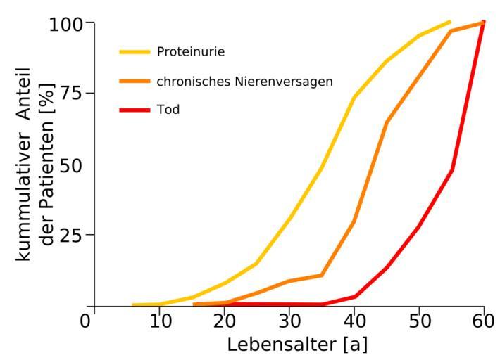 | Keywords: Morbus Fabry renal affairs.svg Der kummulative Anteil an Patienten mit Morbus Fabry die Proteinurie gelb und chronisches Nierenversagen rot aufweisen Die rote Kurve ist die à berlebensrate data taken from M H Branton R Schiffmann u a Natural history of Fabry renal disease influence of alpha-galactosidase A activity and genetic mutations on clinical course In Medicine Band 81 Nummer 2 März 2002 S 122 “138 ISSN 0025-7974 PMID 11889412 own work with Inkscape 2011-09-16 own data from M H Branton R Schiffmann u a Natural history of Fabry renal disease influence of alpha-galactosidase A activity and genetic mutations on clinical course In Medicine Band 81 Nummer 2 März 2002 S 122 “138 ISSN 0025-7974 PMID 11889412 Cc-zero Fabry disease |