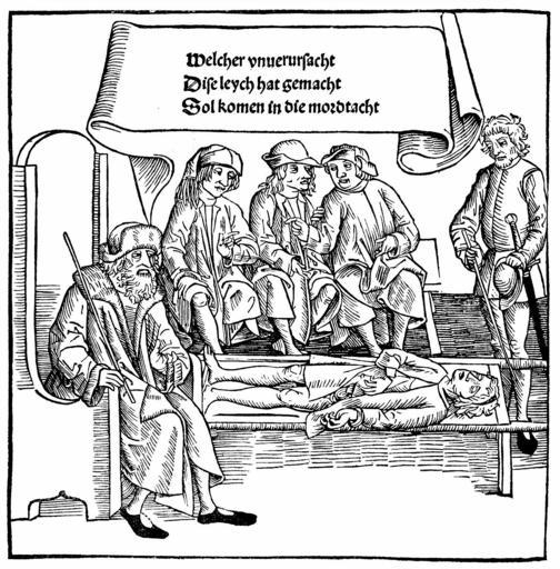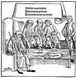 Keywords: Mordacht.png Schöffen sitzen um einen Erschlagenen und beschließen die Mordacht über den abwesenden Täter Rechts berührt der Gerichtsdiener die Bahre mit dem Stab Wolfgang Schild “- Die Geschichte der Gerichtsbarkeit München Verlag Georg D W Callwey 1980 Lizenz für Nikol Verlagsgesellschaft mbH Hamburg 1997 S 157 Scan ISBN 3-930656-74-4 Wolfgang Katzenheimer 1507 PD-Art-100 Judges Deaths from murder 16th-century woodcuts of people Sitting people in art People with banners Corpses in art De Bambergische Peinliche Halsgerichtsordnung/Images People with corpses in art |