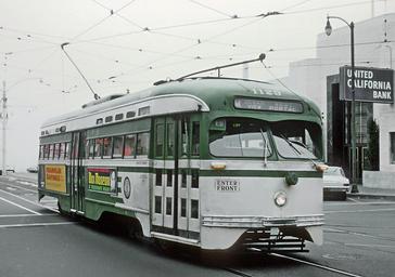 Keywords: san francisco sanfrancisco car vehicle outdoor The other day I posted the middle photo in this 3-photo sequence. I said I thought Car 1129 was about to be wyed at West Portal because of what Roger Puta said the roll sign read. Yesterday I found the other two slides in the sequence. This is PCC 1129, a M OCEAN VIEW WEST PORTAL short turn car at the West Portal (West Portal Ave and Ulloa St). in San Francisco, CA on taken by Roger Puta on August 24, 1967. Ulloa Street is perpendicular to West Portal Ave. a couple of hundred feet west from the actual portal. Ulloa is what the L TARAVAL cars use to get over to Taraval. 1. 1129 on West Portal Ave. approaching the West Portal Station. 2. 1129 in the West Portal Station. Roger caught her with her front pole up and rear pole down ready to back on to Ulloa St. 3. 1129 backing onto Ulloa still with her front pole up and rear pole down. Next she will turn west on West Portal Ave. Questions: Will she then back into West Portal station to pick up passengers (which makes sense) or will she just head out West Portal Ave.? Did the short-turn cars make slightly different moves in the a.m. when most passengers were inbound than in the p.m. when most passengers were outbound? When heading west, what did 1129's roll sign say? I have stood and watched the action at West Portal during the afternoon rush when it was all Boeings (no short turns) and it was a pretty busy place. I can't envision a short-turn making wying movements every few minutes. Did the other lines radiating out from West Portal have west-end short turns? I can't remember seeing short turns on the less traveled end of a streetcar line in any city. So you MUNI historians please help me understand this. The other day I posted the middle photo in this 3-photo sequence. I said I thought Car 1129 was about to be wyed at West Portal because of what Roger Puta said the roll sign read. Yesterday I found the other two slides in the sequence. This is PCC 1129, a M OCEAN VIEW WEST PORTAL short turn car at the West Portal (West Portal Ave and Ulloa St). in San Francisco, CA on taken by Roger Puta on August 24, 1967. Ulloa Street is perpendicular to West Portal Ave. a couple of hundred feet west from the actual portal. Ulloa is what the L TARAVAL cars use to get over to Taraval. 1. 1129 on West Portal Ave. approaching the West Portal Station. 2. 1129 in the West Portal Station. Roger caught her with her front pole up and rear pole down ready to back on to Ulloa St. 3. 1129 backing onto Ulloa still with her front pole up and rear pole down. Next she will turn west on West Portal Ave. Questions: Will she then back into West Portal station to pick up passengers (which makes sense) or will she just head out West Portal Ave.? Did the short-turn cars make slightly different moves in the a.m. when most passengers were inbound than in the p.m. when most passengers were outbound? When heading west, what did 1129's roll sign say? I have stood and watched the action at West Portal during the afternoon rush when it was all Boeings (no short turns) and it was a pretty busy place. I can't envision a short-turn making wying movements every few minutes. Did the other lines radiating out from West Portal have west-end short turns? I can't remember seeing short turns on the less traveled end of a streetcar line in any city. So you MUNI historians please help me understand this.