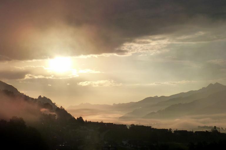 Keywords: morgenstimmung clouds mountains back light village sun fog autumn haze nature landscape morning light