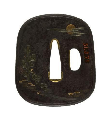 Keywords: Morikawa Toshikage - Tsuba with Stone Rabbit with a Blossoming Plum Branch - Walters 51371 - Back.jpg On the right of this tsuba is a stone rabbit with a branch of plum blossoms in its back Two birds fly over the central opening A stream is shown at the lower left Rabbits are one of the zodiac animals and often depicted in Japanese art On the reverse are a pine branch by a river and a full moon at the upper right 1864 late Edo iron gilt gold silver cm 6 8 accession number 51 371 20775 Henry Walters Baltimore date and mode of acquisition unknown Walters Art Museum Henry Walters Acquired by Henry Walters Signature Hôshinsai/Toshikage; Date Genji ki-no-e ne chûshû/ kao ; Translation Mid-autumn Genji year of the rat 1864 place of origin Edo present-day Tokyo Japan Walters Art Museum license Tosogu Japanese sword fittings in the Walters Art Museum Morikawa Toshikage Media contributed by the Walters Art Museum needs category review |