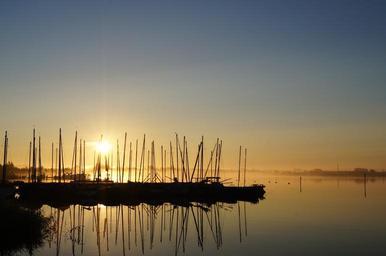 Keywords: morning sun fog sailing boats sail masts sky sea water lake port boats sun morning