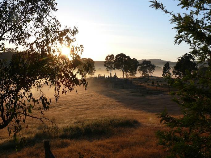Keywords: morning sunrise sun country bush farm property tree gum field sky