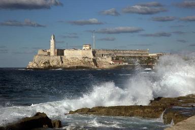Keywords: morro castle fortress historic landmark fort heritage building ocean spray waves splash tide foam rocks beach havana cuba