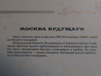 | Keywords: Moscow in XXIII Century. Central Air Vokzal. 1914 B.jpg Moscow in XXIII Century Central Air and Land Vokzal Russian Empire postcard Einem Factory 1914 Moscow Side B Почтовая ка точка из се ии осква в 23 веке шоколадной фи мы Эйнем 1914 года - Цент альный Вокзал Земных и Воздушных Путей Сообщения Об атная сто она Текст «Зима такая же как и п и нас 200 лет назад Снег такой же белый и холодный Цент альный Вокзал Земных и Воздушных Путей Сообщения Десятки тысяч п иезжающих и уезжающих все идет ч езвычайно быст о планоме но и удобно К услугам пассажи ов земля и воздух Желающие могут двигаться с быст отою телег амм» A reproduction of the postcard dated early 20th century photo / Реп одукция почтовой ка точки 1914 года фото бумажной ве сии 1914 unknown and is not indicated on the postcard / на отк ытке не указан PD-old PD-RusEmpire Moscow in XXIII Century fiction |