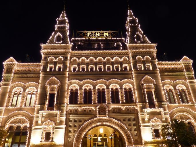 Keywords: moscow russia capital historically kremlin architecture tower red square night evening dark darkness lighting department store gum lights portal