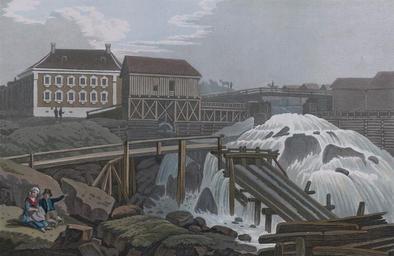 | Keywords: Moss-Bernt-Ankers-house.jpg Artwork Creator John William Edy en Honourable B Anker's House at Mos No LXVIII HONOURABLE BERNARD ANKERs HOUSE AT MOS Tins house was the occasional residence of the late honourable chamberlain Bernard Anker when he visited the town of Moss Norway Mos It is a spacious and convenient dwelling calculated for entertaining the large parties who generally attended him from the town of Christiania to enjoy the society and partake of the unbounded hospitality of that great and good man The house is built in the old style with high roof covered with dark red glazed pantiles enclosing a square court-yard Two sides of the quadrangle are appropriated to state rooms ; the other two contain suites of apartments and lodging rooms for visitors The principal fronts of this end are ornamented with pilasters and windows in the Palladian style painted white The spacious rooms have brilliant cut glass chandeliers suspended from the ceilings; and the walls are decorated with large pictures in distemper representing some considerable water-falls in Norway They are furnished in an elegant and comfortable manner as billiard and ball rooms and other festal apartments the usual appendages to great houses in Norway From the front on the left or west side is seen a part of the iron-works with the furnace forges extensive yards and wharfs and vast quantities of that metal wrought into different forms Beyond the foundry is a large stable for the horses employed in which is a pillar of salt for them occasionally to lick a custom esteemed very salutary in this country The misplaced saw-mills in front interrupts all view of the cascade from the windows between which and the house the high road from Christiania winds over the bridge into the town of Mos The water for the mills is collected from above the bridge and is conveyed in a tank through the arch to the first wheel under which it is again carefully collected in a kind of box and transmitted by three shutes as seen before the great fall to the next mill regulated by small sluices at the half bridge where after use it is likewise preserved and continued to the next and the others in succession thus commanding a high descending power not to be gained by the fall alone for so many mills An equal distribution of water occurs on the other side of the fall where the greater number of wheels are; the foundations of the mills are composed of rough hewn trees laid across each other at right angles resting their bases on the rocks and open within A crank is formed on the axis of the wheel to which the saw is affixed at bottom and to a stationary swivel at the top working perpendicularly The timber is secured on a moveable frame in grooves midway which the machinery pulls up to the saw at every cut during its operations by means of a click wheel They are boarded on the outside and covered with red pantiles on the roof The saw dust falls into the water to the great obstruction of the navigation of many rivers and to the detriment of the fish in Norway Perhaps the absence of salmon in some places may be attributed in a great measure to this improvident and injurious custom Collapse bottom http //urn nb no/URN NBN no-nb_digibok_2011072910001 Boydell's picturesque scenery of Norway London 1820 Plate no 68 p 345 in scanned copy 59 439444 10 669440 20 Location estimated no-nb_digibok_2011072910001 PD-Art-100 Uploaded with UploadWizard Moss Jernverk Moss Norway in art John William Edy Boydell's picturesque scenery of Norway Konvensjonsgården Waterfalls in Østfold |