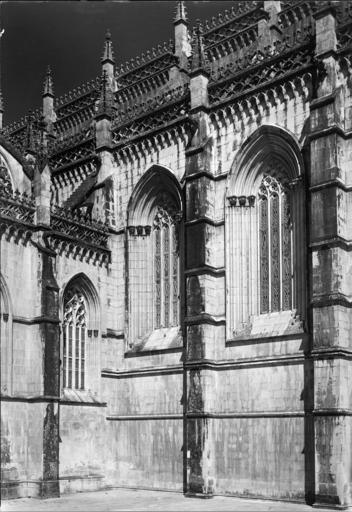 Keywords: arquitectura gótico portugal batalha mosteiro santa vitória fundação calouste gulbenkian fundaçãocaloustegulbenkian maria pia mariapia mário tavares chicó máriotavareschicó mário novais márionovais gótica biblioteca de arte bibliotecadearte Fachada lateral: pormenor. Fotógrafo: Mário Novais, 1899-1967. Orientador científico: Mário Tavares Chicó, 1905-1966. Data aproximada da produção da fotografia original: 1954. O Mosteiro da Batalha é o mais importante símbolo da Dinastia de Avis. Ele foi construído por iniciativa de D. João I, na sequência de um voto à Virgem, caso vencesse a Batalha de Aljubarrota (1385). Ao longo do século XV, praticamente todos os monarcas aqui deixaram a sua marca. O arranque das obras deu-se em 1388 e foi conduzido por Afonso Domingues, que se manteve à frente do estaleiro até 1402, ano em que faleceu. A ele se atribui o plano geral da construção e o grande avanço dos trabalhos na igreja e no claustro. Não terá tido tempo de executar a fachada principal nem o abobadamento do templo, deixando igualmente inacabado o claustro. A magnífica igreja de três naves e transepto saliente por si delineada, com cabeceira de cinco capelas, sendo a central de duplo tramo e terminação poligonal, terá sido o ponto alto da sua carreira, mas revela bem o nível ainda algo arcaizante da arquitectura portuguesa de finais do século XIV, alheia aos progressos do Gótico Flamejante, que tanto iria marcar a segunda fase do monumento. Com efeito, a partir de 1402, a chefia do estaleiro foi entregue a Huguet, arquitecto de provável origem catalã que inaugurou, entre nós, o tardo-gótico. Documentado à frente do projecto até 1438, a ele se deve o abobadamento dos espaços da igreja e da Sala do Capítulo (onde experimentou, pela primeira vez, uma abóbada estrelada), a construção da Capela do Fundador e, ainda, o início das obras das Capelas Imperfeitas, bem como a conclusão da fachada principal, onde sobressai o portal axial. Este, é delimitado por um arco canopial que integra os escudos de D. João I e de D. Filipa. No tímpano, exibe-se Cristo em Majestade ladeado pelos Evangelistas e as arquivoltas são repletas de figurações que continuam pelas estátuas-colunas, ao abrigo de um complexo programa iconográfico. Mas a mais emblemática obra de Huguet é a Capela do Fundador. Ela foi concebida para panteão régio e sabemos que já se encontrava em obras em 1426. É um compartimento quadrangular que se adossa aos três tramos ocidentais da fachada lateral Sul e integra, ao centro, um esquema octogonal de suportes onde descarrega a abóbada estrelada, solução primeiro experimentada em Inglaterra, mas rapidamente difundida pela Europa. No circuito interior desta capela, colocou-se o túmulo duplo de D. João I e de D. Filipa, realização igualmente sem antecedentes no nosso país e que resulta de uma nítida influência da tumulária inglesa. Na capela repousam também os filhos do casal régio (como D. Henrique e o regente D. Pedro), de acordo com a decisão testamentária de D. João I em fazer deste espaço um efectivo panteão. Em 1436, D. Duarte decidiu edificar uma capela funerária para si próprio. O projecto então concebido por Huguet foi o mais arrojado da sua carreira na Batalha, privilegiando uma planta circular que, todavia, não viria a ser concluída pelo falecimento do mestre dois anos depois. Desta forma, e não obstante a intervenção de Mestre Martim Vasques, a construção cessou até ao reinado de D. Manuel e, mesmo nessa altura, não foi concluída, razão de esta parcela ser conhecida como as Capelas Imperfeitas. No reinado de D. Afonso V, edificou-se o segundo claustro do mosteiro. Ele resulta da intervenção do arquitecto Fernão de Évora e, estilisticamente, é uma obra que contraria o tardo-gótico de raiz flamejante, tendo-se optado deliberadamente pela austeridade arquitectónica, que rejeita até a inclusão de capitéis a marcar o arranque dos arcos. A Batalha teve outras fases construtivas igualmente relevantes, como o Manuelino ou o Renascimento. Todavia, a mudança dinástica verificada com D. Manuel privilegiou outros locais e, só no século XIX, o Mosteiro voltou a ser intervencionado, desta vez com o objectivo de restaurar o conjunto, campanha que se prolongou por meio século. (Fonte: IPPAR - tinyurl.com/5dmlfe) [CFT015.154.ic] Fachada lateral: pormenor. Fotógrafo: Mário Novais, 1899-1967. Orientador científico: Mário Tavares Chicó, 1905-1966. Data aproximada da produção da fotografia original: 1954. O Mosteiro da Batalha é o mais importante símbolo da Dinastia de Avis. Ele foi construído por iniciativa de D. João I, na sequência de um voto à Virgem, caso vencesse a Batalha de Aljubarrota (1385). Ao longo do século XV, praticamente todos os monarcas aqui deixaram a sua marca. O arranque das obras deu-se em 1388 e foi conduzido por Afonso Domingues, que se manteve à frente do estaleiro até 1402, ano em que faleceu. A ele se atribui o plano geral da construção e o grande avanço dos trabalhos na igreja e no claustro. Não terá tido tempo de executar a fachada principal nem o abobadamento do templo, deixando igualmente inacabado o claustro. A magnífica igreja de três naves e transepto saliente por si delineada, com cabeceira de cinco capelas, sendo a central de duplo tramo e terminação poligonal, terá sido o ponto alto da sua carreira, mas revela bem o nível ainda algo arcaizante da arquitectura portuguesa de finais do século XIV, alheia aos progressos do Gótico Flamejante, que tanto iria marcar a segunda fase do monumento. Com efeito, a partir de 1402, a chefia do estaleiro foi entregue a Huguet, arquitecto de provável origem catalã que inaugurou, entre nós, o tardo-gótico. Documentado à frente do projecto até 1438, a ele se deve o abobadamento dos espaços da igreja e da Sala do Capítulo (onde experimentou, pela primeira vez, uma abóbada estrelada), 