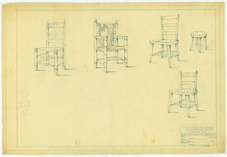 | Keywords: mother neff state park motherneffstatepark texas state parks texasstateparks civilian conservation corps civilianconservationcorps ccc sketch drawing text Furniture, including different chairs and one foot stool. Early date: 1934 Late date: 1945 Pencil and colored pencil on paper. Various comments on front and reverse. LN: 37.75 x WD: 25.625 Furniture, including different chairs and one foot stool. Early date: 1934 Late date: 1945 Pencil and colored pencil on paper. Various comments on front and reverse. LN: 37.75 x WD: 25.625 |