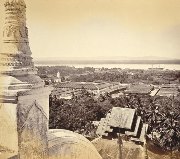 | Keywords: Moulmeinfromgreatpagoda.JPG This is a low-resolution version of Photograph of Moulmein Mawlamyaing taken in Burma Myanmar in the 1870s by Samuel Bourne 1832-1912 part of the Gladstone Collection Moulmein the chief town of the Mon State lies on the coast of south-east Burma at the mouth of the Thanlwin Salween river where it meets the Gulf of Martaban Mottama It developed as a colonial town between 1827 and 1852 when it was the administrative capital of British Burma During this period it became a major centre for the export of teak and remains an important seaport for coastal shipping A number of shrines and monasteries like the Kyaikthanlan Pagoda referred to in Rudyard Kipling's poem 'Mandalay' were built on a ridge of hills running north-south in east Moulmein commanding a view of the town and river In this view the Jail buildings are seen with the Thanlwin in the distance The original image was downloaded from the website http //www collectbritain co uk/ Sanjay Tiwari 02 41 4 October 2006 UTC PD-old-70 PD-old Salween River Samuel Bourne Mawlamyaing |