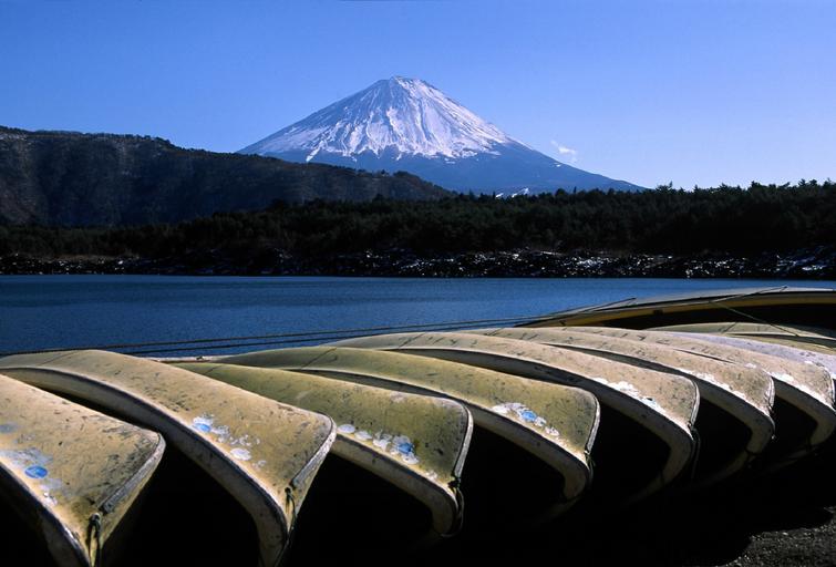 Keywords: mount fuji boats lake landscape outdoors scenic japan asia landmark peak snow tourist scene peaceful
