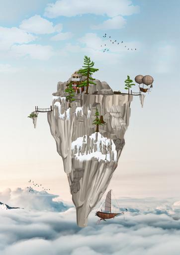 Keywords: mountain island clouds sky snow home trees airship bridge suspension bridge nature mystical float fairy tales mood atmosphere