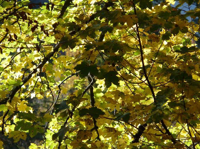 Keywords: mountain maple leaves green autumn acer pseudoplatanus maple acer deciduous tree forest bright sun back light colorful color tree road autumn forest fall foliage