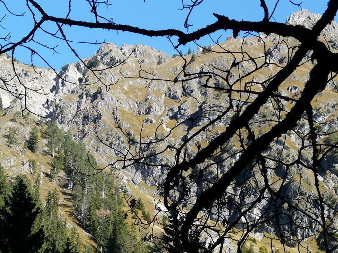 Keywords: mountains alpine allgäu hike sunny day tree branches aesthetic idyll lower gutenalpe oytal sea walls