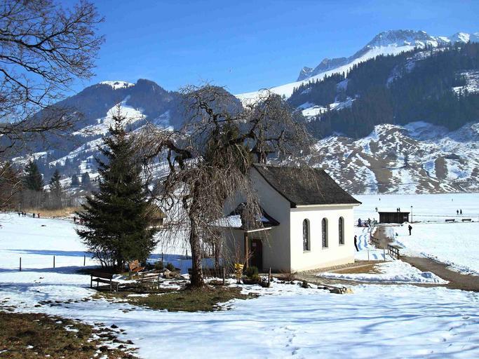 Keywords: mountains mountain landscape nature high mountains hiking chapel faith walk trees switzerland meadow sunny snow winter cold black lake