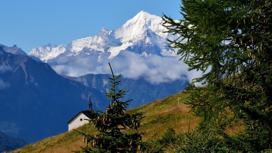 Keywords: mountains outlook landscape nature mountain peaks sky firs chapel alpine meadow forest
