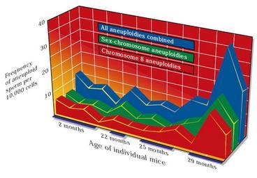 Keywords: Mouse sperm mutation.jpg en In the sperm of aged mice as in older humans we have found the largest age-related increases in two aneuploid conditions XX8 and YY8 These curves show that the frequencies of aneuploid chromosomes in the sperm of mice increase with increasing age especially after two years This figure includes only those instances in which cells have gained a chromosome X Lowe et al Aneuploidies and Micronuclei in the Germ Cells of Male Mice of Advanced Age Mutation Research ; 1995 fr Dans le sperme de souris âgées comme dans les vieux humains nous avons identifié les plus fortes augmentations liées à l'âge de deux conditions aneuploïdes XX8 et YY8 Ces courbes montrent que les fréquences de chromosomes aneuploïdes dans le sperme de souris augmentent avec l'âge surtout après deux ans Ce chiffre ne comprend que les cas dans lesquels les cellules ont acquis un chromosome D'après X Lowe et al Aneuploidies and Micronuclei in the Germ Cells of Male Mice of Advanced Age Mutation Research ; 1995 https //www llnl gov/str/pdfs/11_95 1 pdf Lawrence Livermore National Laboratory / US Government /Department of Energy's 1995 see also Andy Wyroboek The Genetic Contribution of Sperm Healthy Baby or Not ; Science Technology Review November/December 1995 https //www llnl gov/str/pdfs/11_95 1 pdf On line PDF Biology diagrams PD-USGov |