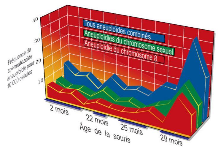 | Keywords: Mouse sperm mutation fr2.jpg en In the sperm of aged mice as in older humans scientist have found the largest age-related increases in two aneuploid conditions XX8 and YY8 These curves show that the frequencies of aneuploid chromosomes in the sperm of mice increase with increasing age especially after two years This figure includes only those instances in which cells have gained a chromosome From X Lowe et al Aneuploidies and Micronuclei in the Germ Cells of Male Mice of Advanced Age Mutation Research ; 1995 fr Chez la souris comme chez l'humain le taux de mutation des spermatozoïdes augmente Il augmente le plus avec l'âge pour les mutations aneuploïdes XX8 et YY8 Ces graphes montrent que les fréquences de chromosomes aneuploïdes dans le sperme de souris augmentent avec l'âge surtout après deux ans Ces chiffres ne concernent que les cas où les cellules spermatozoïdes ont acquis un chromosome supplémentaire X Lowe et al Aneuploidies and Micronuclei in the Germ Cells of Male Mice of Advanced Age Mutation Research ; 1995 D'après X Lowe et al Aneuploidies and Micronuclei in the Germ Cells of Male Mice of Advanced Age Mutation Research ; 1995 https //www llnl gov/str/pdfs/11_95 1 pdf Lawrence Livermore National Laboratory / US Government /Department of Energy's 1995 Mouse_sperm_mutation jpg with english legend see also Andy Wyroboek The Genetic Contribution of Sperm Healthy Baby or Not ; Science Technology Review November/December 1995 https //www llnl gov/str/pdfs/11_95 1 pdf On line PDF PD-USGov PD-USGov Biology diagrams |