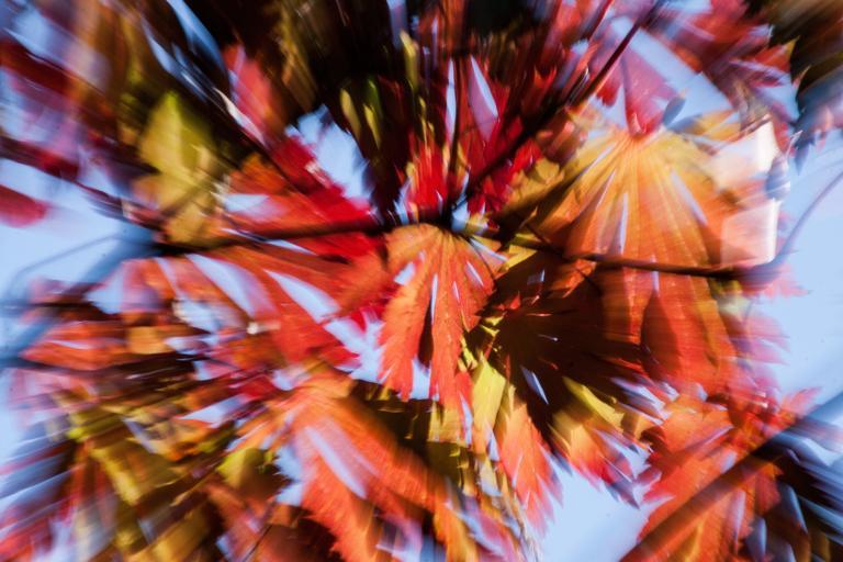 Keywords: movement leaves colorful color japanese maple yellow red brown recoloring the leaves yellowish red dye anthocyanin zoomed sun sky blue autumn