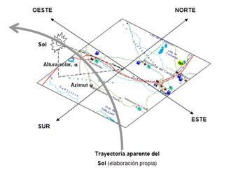 | Keywords: Movimiento Solar.png es Necesitamos referenciar las posiciones relativas del Sol y Tierra y por simplicidad se adopta el modelo en el que se supone que el Sol describe un movimiento aparente de rotación en torno a la Tierra Conviene recordar las diferencias entre hora solar y hora civil La primera es cuando el Sol pasa por el plano que contiene el meridiano del lugar es decir coincide con el cenit recta imaginaria que une el centro de la Tierra con el observador en la superficie en lo que se llama mediodía solar La hora oficial local tiene correcciones sobre la hora solar que incluyen la diferencia de meridianos sobre los que se encuentra el observador y el que se usa como referencia para la hora oficial otra corrección que recoge la llamada ecuación del tiempo que corrige el efecto de las perturbaciones en la velocidad de la Tierra y el Sol y por último la que los gobiernos suelen incluir de forma artificiosa atendiendo a consideraciones de ahorro energético El análisis de la posición relativa del Sol respecto de una superficie cualquiera ligada a la Tierra precisa la elección de un sistema de referencia para lo cual se elige un sistema inercial con origen en el punto de la superficie terrestre donde se encuentra el observador own EUDE Cc-zero Sun Diagrams in Spanish |